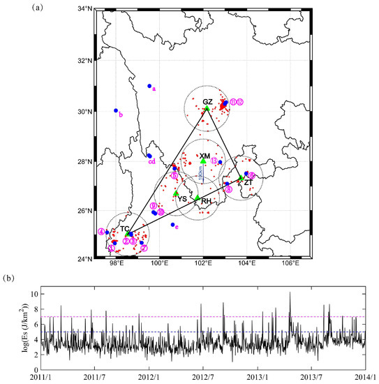 Earthquakes occur when energy stored in elastically strained rocks is suddenly released. Local earthquake energy includes kinetic and strain energy carried by seismic waves, both of which depend on the magnitude of the earthquake and the hypocenter distance [35]. Therefore, in this study, we employed the parameter which considers both factors, in order to identify earthquake events. We selected shallow earthquakes (with depth of 0–60 km and magnitude greater than 1 ()) that occurred during 2011–2014 in the study region. The index is the daily sum of the local earthquake energy associate with strain network, , whereas is the energy of a local earthquake [35,45]. index is defined by the following equation: