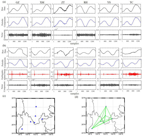 (a) an example of the MSSA results of an aseismic day. Black lines indicate the raw data of the six nodes, while the blue and grey lines represent the periodic components and noise components of the strain, respectively; they correspond to the six nodes after MSSA; (b) an example of the MSSA results of an anomaly day. Black lines indicate the raw data of six nodes; red lines are the grouped earthquake-related strain changes after MSSA, and blue and grey lines are the periodic components and noise components of the strain, respectively; (c) the borehole strain network corresponding to (a). There are no connected edges in the network for an aseismic day; (d) the borehole strain network corresponding to (b). This is a fully connected network.