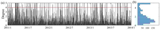 (a) the daily degree of the borehole strain network during 2011–2014. The horizontal red dotted line indicates 80% of the fully connected networks; (b) histogram of the three-year degrees.