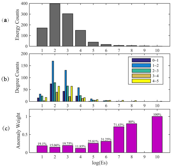 First, we calculated all the local earthquake energy in the study area from 2011 to 2014. We then analyzed the energy distribution as illustrated in Figure 5a, and found that the most probable local earthquake energy values were and . As the energy increased, the number decreased exponentially. Then, we counted the distribution of degrees in each energy interval, as shown in Figure 5b. In each energy interval, the distribution of degrees was still skewed and extreme. In particular, degrees of 4 to 5 seemed to account for a certain amount. Following this, the weights of degree anomalies in each energy interval were computed as shown in Figure 5c. We found that the weight of degree anomalies increased as the local earthquake energy increased for energy values greater than . This indicated that there was a correlation between strain network anomalies and earthquakes with energy greater than . Therefore, we consider that the network anomalies can reflect the anomalous underground deformation, which is very important information when studying earthquake precursors. In addition, this also verified the threshold selected had the ability to distinguish network anomalies.
