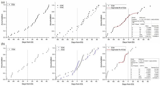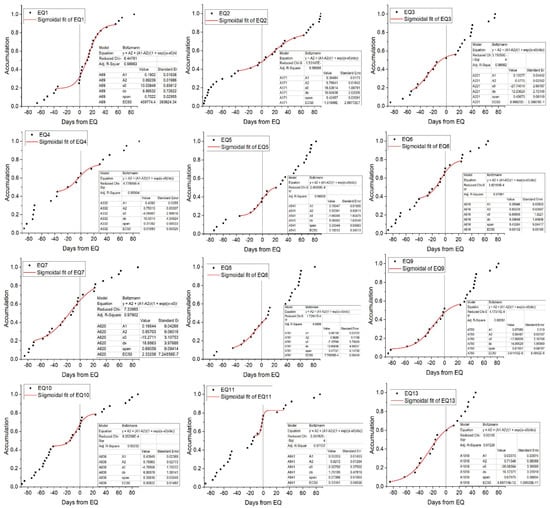 where , , , and are the asymptotic lower limit, asymptotic upper limit, inflection point, and time constant, respectively. This function is characterized by two different behaviors with opposite concavities before and after a center point (); can be seen as a reflection of the acceleration rate of the function. The smaller the value, the faster the function grows, and vice versa. These parameters have been widely used to describe seismic anomalies [13]. The results are presented in Figure 6. The fitting parameters are provided in the right corner of each graph. Adj R-square is goodness of fit, the closer to 1, the better is. Almost all the Adj R-square of fitting exceeded 0.97, indicating the fitting results were very convincing.