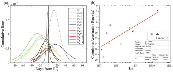 (a) cumulative rates of the degree anomalies before and after the 13 major earthquakes (the vertical black lines at the 0 day). The colors indicate corresponding earthquakes; (b) correlation between local earthquake energy and cumulative acceleration rate of EQ3–EQ13, excluding EQ12 as it is the second day of EQ11; it was omitted as its accumulation was considered to come mainly from EQ11. The colors indicate corresponding earthquakes.
