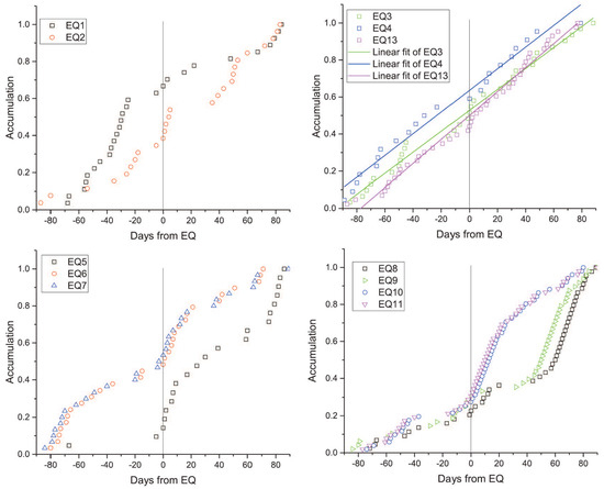 Second, there was a correlation between strain network anomalies and earthquakes with larger energy as shown in Figure 5. In order to confirm whether the detected network anomalies are due to the foreshock activities or underground strain changes, we further computed the cumulative values using the same procedure as above. We set threshold as . If the value greater than this threshold, we counted one for the corresponding day, then added up the counts in the same window (90 days before and after the event day). The accumulation of the values greater than for each event are shown in Figure 8. Compared with strain network anomalies for the 13 major earthquakes, the results of values didn’t show the pre-earthquake enhancements. The accumulation of some earthquakes have similar characteristics, thus we laid them in four sub-graphs (EQ12 was also omitted). In the 40 to 20 days before the EQ1 and EQ2, local seismicity increased, but, in the strain network, the anomalies enhanced after the earthquake. In the first half year of 2011, earthquakes were active near the TC station. However, the station is far away from the central area of the strain network, so it was reasonable that the results were inconsistent. Before and after the EQ3–EQ4 and EQ13, there were no significant changes, and the linear fits also showed that these major earthquakes had little effect on local seismicity. There were also no increases in seismicity prior to the EQ5–EQ7 and EQ8–EQ11. On the contrary, possibly due to the aftershocks of EQ5–EQ7 and EQ10–EQ11, the accumulations of these earthquakes had several significant overlaps. The results showed that the foreshock activities were different from the detected changes of the strain network before major earthquake events. Therefore, the strain network anomalies before major earthquakes () were more likely to be related to the underground strain changes than their foreshocks.
