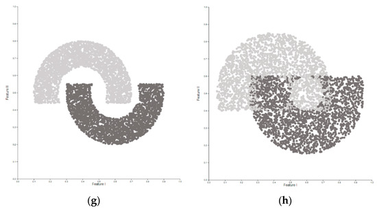 This figure presents the data sets that were used in the research: (a) circle_in_ring; (b) circle_in_ring_ns; (c) circle_and_moon; (d) circle_and_moon_ns; (e) two_moons; (f) two_moons_ns; (g) two_moons_mirrored; (h) two_moons_mirrored_ns.