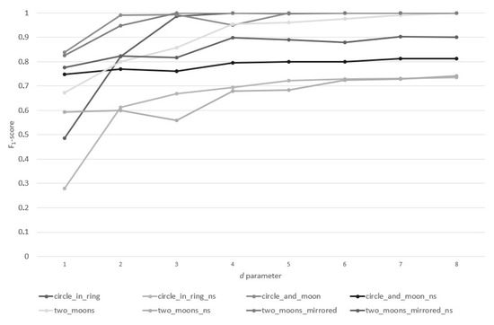 At the maximum depth level (Figure 5) that was examined, in case of data sets with clearly separated classes—circle_in_ring, circle_and_moon, two_moons and two_moons_mirrored—there is no significant difference between the obtained and values. In terms of data sets in which the classes are not separated from each other (data sets with ns-postfix in its name), the differences in the values of both measures fluctuate in the interval of [0.015 ÷ 0.050], while the mean result of the difference between and within the entire experiment with the parameter amounted to .