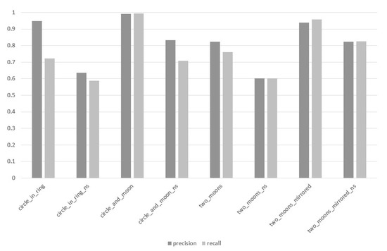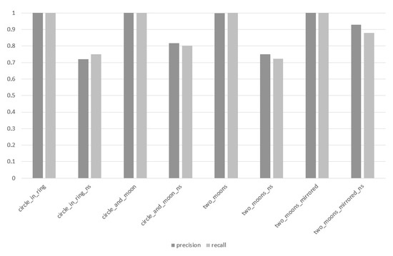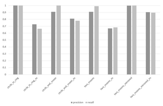 For (Figure 3), the biggest difference in the results of both measures occurs in the case of the circle_in_ring data set and amounts to , whereas the mean difference between the above-mentioned measures within the entire experiment was .