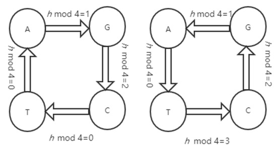 A DNA sequence consists of four nucleic acid bases, A (adenine), G (guanine), C (cytosine), and T (thymine), which satisfy the Watson–Crick structure [20]. The structure of a DNA sequence is a binary string; on each side of the string, every two nucleic acid bases are complementary, following the rules that A and T are complementary and G and C are complementary. Based on the Watson–Crick structure, only eight combinations can be used for DNA coding [20]. These are listed in Table 1.