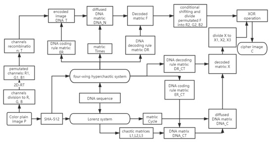 The complete encryption algorithm had a two-round permutation–diffusion structure. In the first round of the permutation–diffusion process, we implemented 2D-RT for permutating the plain image P for t times. Then we decomposed the permutated image P into R1, G1, and B1. The DNA complementary operation was used for the diffusion of the encoded plain image; meanwhile, the DNA cycle operation was implemented for the diffusion of the encoded chaotic matrices. In the second round of the permutation–diffusion process, the conditional shifting was implemented on the decoded images R2, G2, and B2, and we obtained the permutated matrices R3, G3, and B3. Finally, we used the decoded matrices XR, XG, and XB for diffusing matrices R3 and G3. The whole encryption process is demonstrated in Figure 2, and the encryption procedures are described in the subsequent subsections.