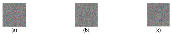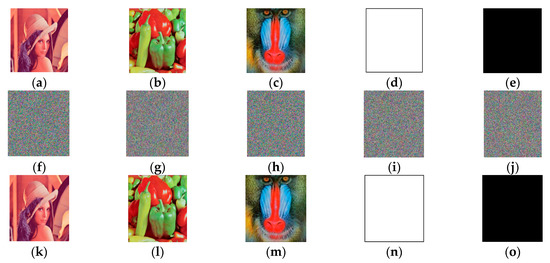 According to Equations (13)–(16), all the initial values of the chaotic systems and the intermittent parameters were determined by the plain image. If there was a one-bit difference between two images, the initial values of the chaotic systems and the intermittent parameters were totally different. Moreover, the chaotic matrices and even the permutated plain images were totally different. Hence, the proposed scheme was sensitive to the plain image.