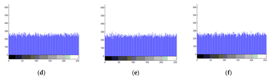 From Table 8, we can see that the variances of the original images are very high, while the variances of the encrypted images are greatly reduced. All encrypted variances are reduced by at least 98% compared to the original image variances. Figure 7 shows histograms of the plain and encrypted image Lena. Figure 7a–c are histograms of the plain image Lena in the R, G, and B channels, and Figure 7d–f are histograms of the encrypted image Lena in the R, G, and B channels, respectively, where x-axis denotes the pixel values in the image while y-axis denotes the frequency of the pixels in the image. From Figure 7, the histograms of the original images have obvious peaks, and histograms of the encrypted images are very uniform. Attackers cannot use a statistical attack to obtain any useful information by analyzing the histogram of the encrypted image. Therefore, our method can effectively resist statistical attacks. Table 9 shows comparison of histogram variance across methods about image Lena. It can be seen from Table 9 that our algorithm can obtain encrypted images with lower histogram variance.