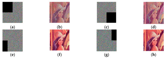 Figure 8 shows stimulation results of occlusion attacks with Lena. Figure 8a,c,e,g respectively represent the images obtained after Figure 3f suffered the different occlusion attack. Figure 8b,d,f,h respectively represent the decrypted images of Figure 8a,c,e,g Evidently, according to Figure 8 and Table 14, all PSNR values were larger than 27, and the decrypted images were all recognizable despite the various sorts of contamination in the encrypted images. Therefore, the proposed method was capable of resisting noise attacks and occlusion attacks.