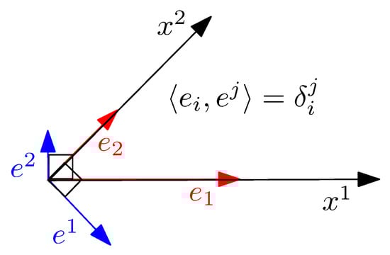 A smooth vector field X is defined as a “cross-section” of the tangent bundle: , where or denote the space of smooth vector fields. A basis of a finite D-dimensional vector space is a maximal linearly independent set of vectors: A set of vectors is linearly independent if and only if iff for all . That is, in a linearly independent vector set, no vector of the set can be represented as a linear combination of the remaining vectors. A vector set is linearly independent maximal when we cannot add another linearly independent vector. Tangent spaces carry algebraic structures of vector spaces. Furthermore, to any vector space V, we can associate a dual covector space which is the vector space of real-valued linear mappings. We do not enter into details here to preserve this gentle introduction to information geometry with as little intricacy as possible. Using local coordinates on a chart , the vector field X can be expressed as using Einstein summation convention on dummy indices (using notation ), where denotes the contravariant vector components (manipulated as “column vectors” in algebra) in the natural basis with . A tangent plane (vector space) equipped with an inner product yields an inner product space. We define a reciprocal basis of so that vectors can also be expressed using the covariant vector components in the natural reciprocal basis. The primal and reciprocal basis are mutually orthogonal by construction as illustrated in Figure 2.