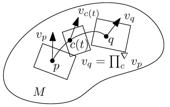 Since the manifold is not embedded in a Euclidean space, we cannot add a vector to a vector as the tangent vector spaces are unrelated to each others without a connection (the Whitney embedding theorem [21] states that any D-dimensional Riemannian manifold can be embedded into ; when embedded, we can implicitly use the ambient Euclidean connection on the manifold, see [22]). Thus a connection ∇ defines how to associate vectors between infinitesimally close tangent planes and . Then the connection allows us to smoothly transport a vector by sliding it (with infinitesimal moves) along a smooth curve (with and ), so that the vector “corresponds” to a vector : this is called the parallel transport. This mathematical prescription is necessary in order to study dynamics on manifolds (e.g., study the motion of a particle on the manifold). We can express the parallel transport along the smooth curve c as: