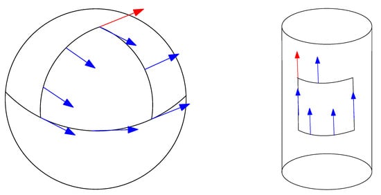 In general, the parallel transport is path-dependent. The angle defect of a vector transported on an infinitesimal closed loop (a smooth curve with coinciding extremities) is related to the curvature. However for a flat connection, the parallel transport does not depend on the path, and yields absolute parallelism geometry [25]. Figure 4 illustrates the parallel transport along a loop curve for a curved manifold (the sphere manifold) and a flat manifold (the cylinder manifold).