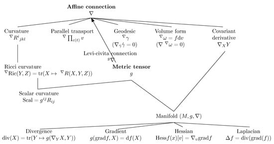 An affine connection is a torsion-free linear connection. Figure 5 summarizes the various concepts of differential geometry induced by an affine connection ∇ and a metric tensor g.