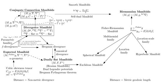 differential geometry; metric tensor; affine connection; metric compatibility; conjugate connections; dual metric-compatible parallel transport; information manifold; statistical manifold; curvature and flatness; dually flat manifolds; Hessian manifolds; exponential family; mixture family; statistical divergence; parameter divergence; separable divergence; Fisher–Rao distance; statistical invariance; Bayesian hypothesis testing; mixture clustering; α-embeddings; mixed parameterization; gauge freedom 1. Introduction