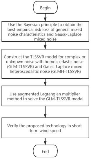 Many regression techniques today assume that this model is a single noise characteristic. Wind speed prediction is complicated by its volatility and uncertainty, so it is difficult to model with a single noise distribution. This section summarizes our main work: (1) we use the Bayesian principle to derive the best empirical risk loss of G-L mixed noise characteristics; (2) the TLSSVR model of G-L mixed homoscedastic noise (GLM-TLSSVR) and G-L mixed heteroscedastic noise (GLMH-TLSSVR) for complicate noise is developed; (3) use the Lagrange function and obtain the dual problem of GLM-TLSSVR and GLMH-TLSSVR according to KKT conditions; (4) solve the GLM-TLSSVR by the ALM method, ensuring the stability and effectiveness of the algorithm; (5) use the proposed technique to predict the future short-term wind speed, calculate wind speed based on past data, and then predict wind speed at some time after 10, 30, and 50 min, respectively. Based on our results, it is observed that GLM-TLSSVR outperforms -SVR, LS-SVR, and TSVR for the short-term wind speed data-set, as shown in the experiment. Further, the ratio of SSR/SST can estimate the goodness of fit of the predictive model and extract the maximum information from the data set. Therefore, the proposed model GLM-TLSSVR is considered to be the best regression indicator among all of the models. A low ratio of SSE/SST implies good estimation between real values and predictive values. In addition, the computational time for all the models is evaluated and it is found that GLM-TLSSVR is the lowest, owing to its smaller sized constrained optimization. These results also bring many benefits to the industrial sector, such as better statistical analysis of the relationship between wind speed characteristics and power generation.