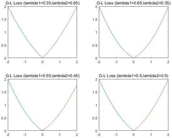 If the noise is Gaussian noise with zero mean and variance of heteroscedasticity, and these variance are , where , , . Similarly, by Equation (1), the empirical risk loss is . A TLSSVR model for Gauss–Laplace mixed heteroscedastic noise characteristics is established, and we named it GLMH-TLSSVR. A pair of optimization problems of GLMH-TLSSVR can be depicted: