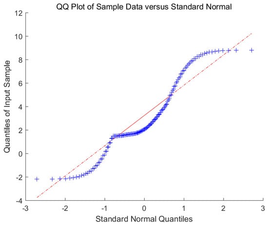 The wind speed forecast error distribution with mixed Gauss-Laplace noise. (This red line is used as a reference. It is determined by the quarter point and the third quarter point. These two points just determine the line in the QQ plot. These blue distribution points are the error between the actual value of wind speed and the predicted value of wind speed.).