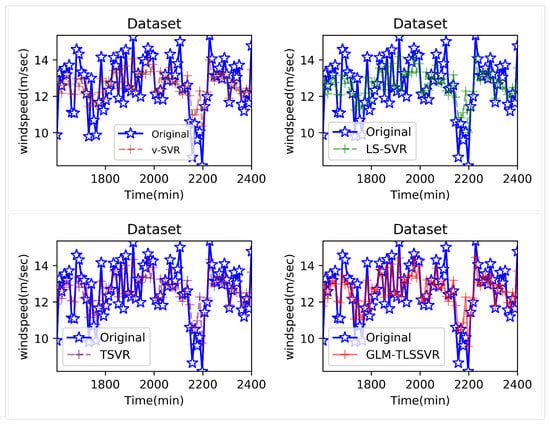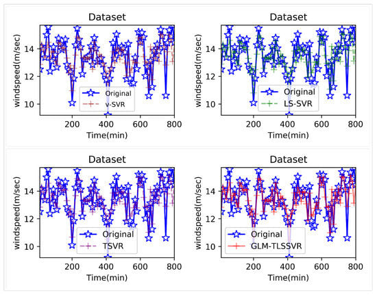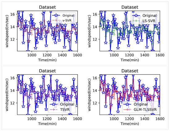 In the section, we confirmed the feasibility and effectiveness of the proposed model GLM-TLSSVR on the short-term wind speed data set of Heilongjiang Province, China. The source of the wind speed data set is a related wind farm under the Meteorological Bureau of Heilongjiang Province, and a lightning imager measures the wind speed. This wind speed data set has been recorded for more than a year, and the average wind speed is recorded every 10 min. In general, we collected a total of 62,466 samples, which have four attributes, namely variance, mean, maximum, and minimum. We use 1440 uninterrupted data samples (from 1 to 1440, the time span is 10 days) as training samples. We also use 720 uninterrupted data samples (from 1441 to 2160, the time span is five days), and 80 consecutive data as the testing samples. As for the original sequence, we need to transform it into a multiple regression task by using mode = as an input vector to predict , where the vector orders of wind speed is determined by the chaotic operator network method. Where is the real value of wind speed at time . In the experiments, we try step = 1, 3, and 5. In other words, we predicted the wind speed of every point after 10, 30, and 50 min, respectively.