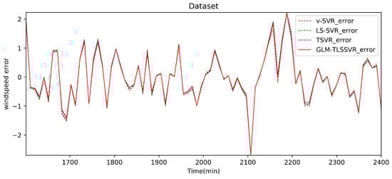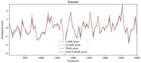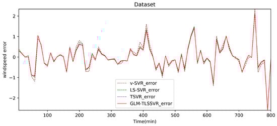 From Table 2, Table 3 and Table 4 and Figure 4, Figure 5, Figure 6, Figure 7, Figure 8 and Figure 9, these evaluation criteria can indicate that the error statistic of GLM-TLSSVR model is better than that of models -SVR, LS-SVR, and TSVR. As the forecast time interval increases from 10-min. to 30-min. and 50-min., the forecasting error of the four models increases and the relative error decreases. Therefore, in these cases, it is not so important. However, as can be seen from Table 2, Table 3 and Table 4, under all conditions of MAE, RMSE, SSE/SST, and SSR/SST, the model GLM-TLSSVR with Gaussian–Laplace mixed noise characteristics is slightly better than the other three classical -SVR, LS-SVR and TSVR models. In general, a lower value of MAE, RMSE, and SSE/SST reflects the consistency between the predicted values and true values, while the higher values of SSR/SST indicate that the regressor accounts for higher statistical information. Further, the performance indices indicate that GLM-TLSSVR outperforms -SVR, LS-SVR, and TSVR for short-term wind speed data set in terms of SSE/SST, RMSE, and MAE. The ratio of SSR/SST can estimate the goodness of fit of the predictive model and extract the maximum information from the data set. Therefore, the proposed model GLM-TLSSVR is considered to be the best regression indicator among all of the models. The SSE/SST is lower for GLM-TLSSVR when compared to other methods that imply good estimation between real values and predictive values from Table 2, Table 3 and Table 4. In addition, among all of the models, the computational cost of testing model GLM-TLSSVR is the lowest, which indicates that our proposed iterative methods are the efficient algorithm for regression, on the other hand, the reason is that this proposed model GLM-TLSSVR combines the spirit with the fast speed of LS-SVR yields a new regressor. In addition, the generalization performance of the proposed model GLM-TLSSVR is best, i.e., it owns the smallest and largest evaluation criteria, respectively, viz. RMSE, and SSR/SST from Table 2, Table 3 and Table 4; this is mainly due to the idea of twin hyperplanes.