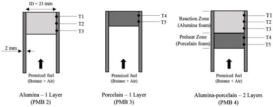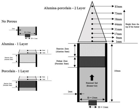 - Janvekar, A.A.; Miskam, M.A.; Abas, A.; Zainal, Z.A.; Juntakan, T.; Abdullah, M.Z. Effects of the preheat layer thickness on surface/submerged flame during porous media combustion of micro burner. Energy 2017, 122, 103–110. [Google Scholar] [CrossRef]