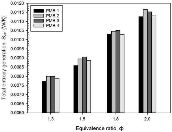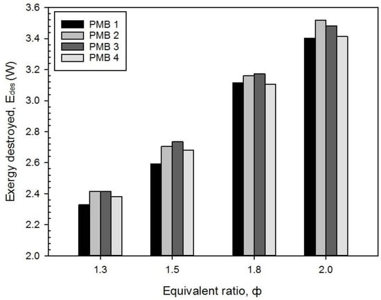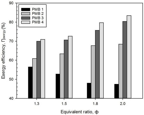- The highest exergy efficiency is 83.47% for PMB4 at φ = 2.0, while the lowest exergy efficiency is 47.40% for PMB1 using a similar equivalence ratio.