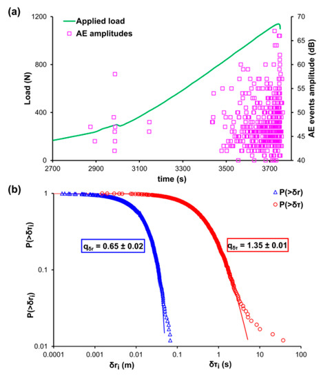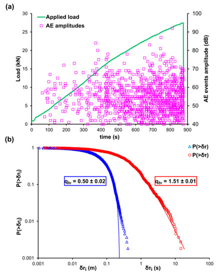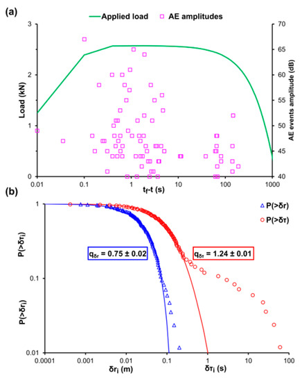 Assessing the accumulated damage and understanding the physical mechanisms behind fractures, which lead to critical failures in mechanically loaded specimens or structures, is important for the scientific and engineering community working in situ. For this purpose, many non-destructive testing techniques have been proposed and tested. Among them is the acoustic emission (AE) technique, which deals with the detection of the transient elastic waves generated during the creation and propagation of microcracks in the bulk of the material when it is subjected to mechanical loading. The elastic waves travel within the material towards its boundaries, where they are detected by piezoelectric sensors properly attached on the material’s surface. Acoustic activity data can provide information about the crack evolution processes that take place inside the material [1]. In this context, specific AE related parameters have been used as pre-failure indicators, allowing the estimation of the overall accumulated damage and remaining loading carrying capacity of specimens or full-scale structures [2,3,4,5,6,7]. The AE technique has also been used in controlled laboratory-scale fracture experiments on brittle rocks in order to investigate potential similarities between the fracture mechanisms taking place in mechanically loaded rocks and earthquakes [8]. Acoustic activity and seismic wave propagation can be studied under the same concepts since they both originate from fracture phenomena that are either limited in laboratory scale or extended in field scale. It is generally accepted that both constitute non-linear processes of complex dynamical systems under non-equilibrium states exhibiting multi-fractal and self-similar structure, long range interaction and memory effects [9,10,11,12]. Due to the complexity of these phenomena, the use of advanced statistical analysis methods is favoured instead of classical statistical physics. In this direction, non-extensive statistical physics (NESP), pioneered by Tsallis [13,14,15,16,17], is based on the principle of entropy, and offers a robust analytical method for describing such complex systems.