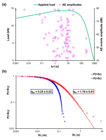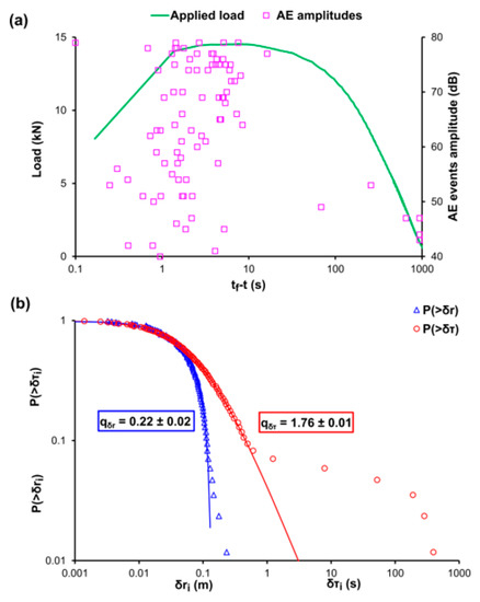 (a) The temporal variation, in terms of the logarithmic (tf-t) scale [50], of the applied mechanical load (green line) and the amplitudes of the recorded AE events (pink square markers) for the case of the cement specimen during the three-point bending experiment E-3 embedded with plastic fibres as internal reinforcement, in terms of the logarithmic (tf-t) scale [50]. (b) The cumulative distribution function (CDF) of the AE inter-event times (red circle markers) and inter-event distances (blue triangle markers), along with the corresponding q-exponential fitting curves (red and blue solid curves).