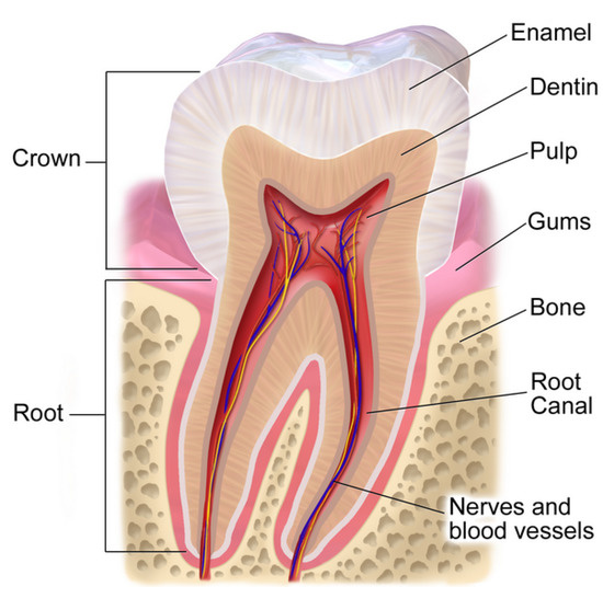 Another medical focused application of EIS is found in dentistry (the branch of medicine focused on studying, diagnosing, treating, and preventing diseases or disorders of the oral cavity) and the non-invasive assessment of dental tissues. The tooth, with dental anatomy depicted in Figure 1 [19], is the hardest substance in the human body [20] with roles for both eating and speech production. From the anatomy, the white outer layer of the crown of the tooth (known as the enamel) is mostly made of calcium phosphate, a rock-hard mineral [20]. Encased by the enamel is the dentin structure, which is a complex hydrated composite and constitutes the bulk of a human tooth [21]. In cases in which the enamel is damaged or decayed, pain, infection, and even tooth loss can occur [20]. The early detection of dental caries (or tooth decay) is a critical activity towards supporting oral health, which provides the motivation behind non-invasive methods for their detection. In several in vitro and in vivo studies, it has been shown that early detection of dental caries poses a major challenge. EIS has recently being investigated for this application [22,23,24,25,26,27]. Using EIS as a diagnostic tool requires determining a marker in the collected data that is strongly associated with the target pathology. Many studies are exploring equivalent electrical circuit parameters that represent EIS data for their association with dental caries. This approach requires that the experimental data are fit to a predetermined electrical circuit model which often incorporate a CPE (a fractional-order circuit element). Electrical circuit models employing CPEs that have been used in studies of the impedance characteristics of dental tissues are given in Table 1. In particular, significant attention has been given to using EIS to determine necessary root canal length measurements as well as the characterization of enamel and dentin structures. A root canal is a dental procedure to remove the infected tooth pulp when it gets infected due to a cavity or trauma. Hence, the success of endodontic treatment depends on the accurate measurement of a tooth root canal length. Various approaches have been employed to locate the canal apex of a diseased tooth [28]. Nowadays, electronic apex locators are used that are based on electrical impedance measurements. In [29], eight equivalent circuit models were compared for measuring root canal length. The most accurate model employed a single CPE in parallel with a series connection of CPE and a resistor. Other studies have: utilized models with a single CPE, two capacitors, and two resistors to represent measurements of tooth enamel [30]; utilized a four element circuit with three-series resistors in parallel with a CPE to represent measurements of dentin [31]; and utilized a model with three resistors and two CPEs during investigations of age related differences in dentin [32]. These highlight the wide range of electrical equivalent models that have been used and for a range of dental applications. The selection of the equivalent electrical circuit to use during the fitting of impedance elements is an important consideration. Often the aim is to utilize a model that has the least number of parameters, but is grounded in the underlying structure of the tissue so that model parameters have a physical interpretation. Determine the most appropriate circuit models for different applications is an active area of EIS, and motivates the work in this study.