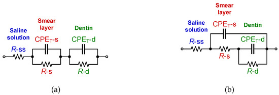 In [32], Eldarrat et al. proposed that the fractional-order circuit model depicted in Figure 2a provided the best fit in terms of accuracy for their experimental data. This model has been previously referred to as the double-dispersion Cole impedance model and will be referred to as the C-C model in this work. Using this model, Eldarrat et al. proposed that the smear layer over the dentin surface and dentin itself have their own resistance (respectively R-s, R-d) and pseudo-capacitance (CPET-s, CPET-d), while the saline solution is purely resistive (R-ss). The impedance in terms of the parallel/series combinations of elements of the C-C model is given by: