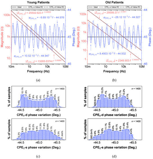 Proposed CPEs of order 0.5 via the Valsa method with ideal and simulated phase and magnitude responses vs. frequency: (a) young, (b) old patients teeth dentin, and (c,d) corresponding phase angle variations.