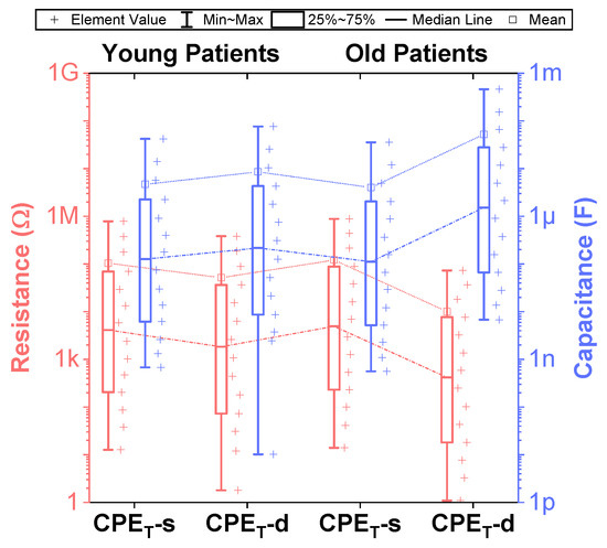 While fractional-order circuit models can be evaluated for their “fit” and representation of electrical impedance data, there are no commercially available fractional-order elements available for their physical realization. Until fractional-order components are readily available, realizing these circuits for SPICE simulations and measurement requires the approximation of the fractional-order elements in these models. To support researchers interested in using an emulated model of dental tissues, the CPEs (adjusted to their nearest EIA standard compliant values) in Table 2 were realized using the Valsa method to realize an RC network with 13 branches [7,36] that approximates the CPE impedance over a fixed frequency band. This electric network is shown in Table 5 for reference. The resistance and capacitance values for this network were computed using the approach detailed in [37] powered by a genetic algorithm. This approach, based on a defined fitness function provides a phase optimization in the desired bandwidth (10 mHz–10 MHz) without any complex mathematical analysis. Table 5 lists the standard EIA compliant RC values used to realize the proposed CPEs with orders of 0.5. The variations of the approximated CPE phase and magnitude for the young and old patients’ teeth dentin compared to the ideal cases and corresponding phase angle changes in form of histograms are given in Figure 4. Further, the fitting equations using a power regression for the magnitudes and linear regression for the phases are given in Figure 4a,b. The coefficient of variation (CoV), which is the relative standard deviation (SD) expressed in percentage, was calculated as . Here, is the mean values of phase angle (order) or pseudo-capacitance values of CPEs. From these values, given in Table 5, the maximum absolute CoV indicators for phase angle (i.e., order) and pseudo-capacitance values of CPEs of young and old patients’ teeth dentin are and , respectively. Hence, the phase angle (order) and pseudo-capacitance mean values of CPEs are close to their theoretical values with low SD. In addition, both absolute relative error of magnitude and absolute phase angle error were calculated for the CPEs approximated using the Valsa approach. The maximum relative magnitude errors of CPEs of young and old patients teeth dentin are equally with maximum phase angle error and , respectively, over frequency range of 10 mHz–10 MHz. These support that the approximated CPEs are a very good representation of the ideal CPEs. To further visualize the range of components required to realize these approximated CPEs, the distribution of resistance and capacitance values for both age groups are also depicted in Figure 5.