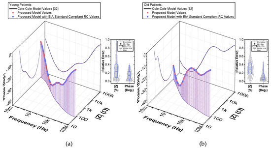 (a) Young and (b) old patients’ teeth dentin: 3D Bode plots of simulated [32] and proposed recurrent circuit models and distribution of absolute relative magnitude and phase angle errors of the model with EIA standard compliant RC values.