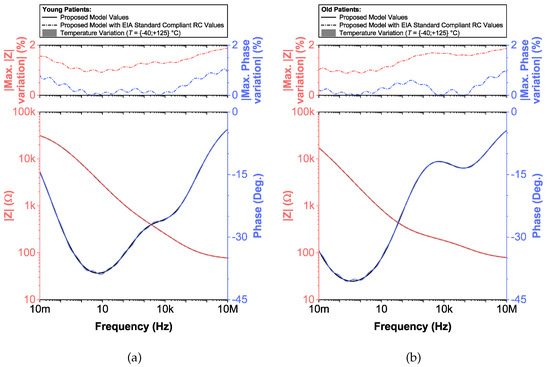 (a) Young and (b) old patients’ teeth dentin: Temperature variation of proposed recurrent circuit models with EIA standard compliant RC values (bottom plots) and distribution of maximum absolute relative magnitude and phase angle variation (top plots) vs. frequency.