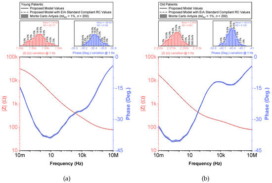 (a) Young and (b) old patients’ teeth dentin: Monte Carlo statistical analysis of proposed recurrent circuit models with EIA standard compliant RC values (bottom plots) and magnitude and phase angle variation at 1 Hz (histograms) vs. frequency.