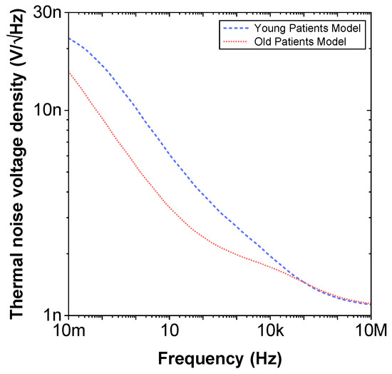 To compare the ideal recurrent model and the model with approximated CPEs, 3D Bode plots of all cases are depicted in Figure 6. The distribution of absolute relative magnitude and phase angle errors of the model with EIA standard compliant RC values is depicted in box and whisker plots with kernel density estimation curves next to 3D plots. The maximum differences between a designed magnitude/phase and a target magnitude/phase for the young and old patients model are and , respectively. The distribution of absolute relative resistance and reactance errors of complex impedance of the same models (Nyquist plots depicted in Figure 3) is shown in Figure 7, in which scatterplots with contour overlay indicate the intensity of corresponding relative errors given in Table 3. The maximum differences between a designed resistance/reactance and a target [32] resistance/reactance for the young and old patients model are and , respectively. These simulations serve to highlight that the approximated CPEs using the Valsa method show good agreement with the theoretical CPE impedance and can be used in future simulation and experimental works that need to emulate the dental tissue impedance. However, they do account for variability that could be introduced based on temperature, process variations, or thermal noise. The effect of temperature on the proposed recurrent circuit models with EIA standard compliant RC values was examined in SPICE software in the range °C. The results of these temperature simulations are depicted in Figure 8a,b. Typical temperature coefficient values of °C and °C were set for resistors and capacitors, respectively, to model the linear temperature dependence of ’off the shelf’ chip components (SMDs, surface-mount devices). The calculated distribution of absolute relative magnitude and phase angle variations (top plots) show maximum change in comparison with the magnitude and phase angle responses obtained at nominal temperature °C. In order to evaluate the potential parameter variation of proposed recurrent circuit models with EIA standard compliant RC values due to tolerances incurred from components manufacturing processes, Monte Carlo statistical analysis was performed for resistors and capacitors with tolerance for Gaussian distribution and 200 iterations. Figure 9a,b show the simulated magnitude and phase responses at (bottom plots) with corresponding statistical evaluation for magnitude and phase angle at 1 Hz (histograms). Finally, the thermal noise voltage of the proposed recurrent circuit models generated by passive components was simulated. It is known, ideal capacitors, as lossless devices, do not generate thermal noise. Hence, the main source of noise in the proposed circuits is the thermal noise of the resistors, which can be expressed as with unit , where k is Boltzmann’s constant ( J/K), T is the absolute temperature in Kelvins, B is the bandwidth in Hertz, and R is the resistance value. The simulated thermal noise voltage density at is depicted in Figure 10. The variability introduced by temperature, thermal noise, and process variation do not significantly degrade the impedance characteristics of the proposed models, supporting that they can be implemented in a wide range of conditions to support future studies needing circuits to emulate the dental tissue impedance.