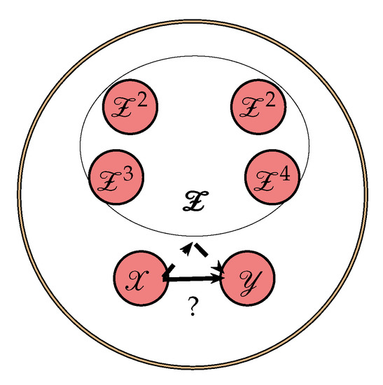 where is CMI. However, in a complex network, it is not guaranteed that (1) only describes the directed dependencies from X to Y. For example, there could be a third process, say Z, through which shared information is mediated to X and Y. In this case, the shared information will lead to an increase in TE. To reduce the effect of common information being shared through other process, it has been suggested to use CTE [13,19]. Let us consider the nodes network in Figure 1, where we are interested in assessing the directed dependencies from node to and which is not due to indirect paths through the remaining nodes . We denote as a stochastic process describes the state visited by and as a 4-variate stochastic process which describes state visited by over time. CTE from an individual source X to the target Y excluding information from is then defined as