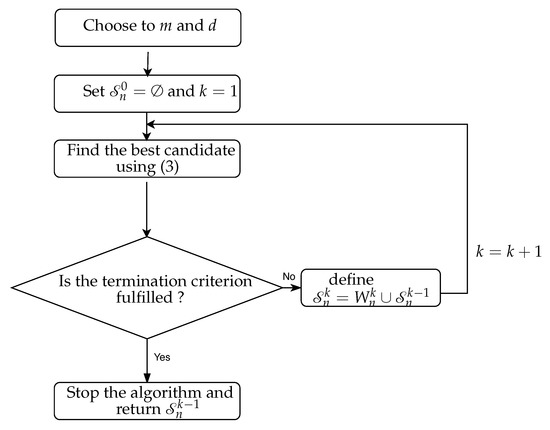 - At each iteration , run a search procedure to select the candidate which leads to the highest amount of new information about target variable and the best prediction of given the random vector . It can be formalized by:where denotes the set of selected candidates up till iteration and refers to all elements of except the elements of . Similar to the existing NUE algorithms, mutual information and CMI are estimated using the KSG approach [13,14,32] (cf. Appendix A.1).