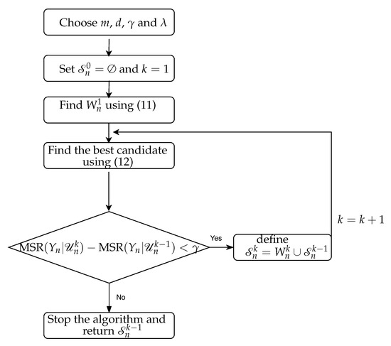 The LA-based strategy follows the same flow chart as the existing NUE algorithm, shown in Figure 2, except that the CMI in (3) is substituted by its LA [21]. It is suggested in [21,23] that using LA of the CMI in (3) can increase the accuracy of estimation of the CMI and may outperform the accuracy of the NUE algorithm. The author in [21] proposed two LA alternatives to the CMI and concluded based on a simulation study that the LA of the CMI used in this study for the sake of comparison with our proposed NUE algorithm, outperforms another LA of the CMI. The criterion for finding the most informative candidates (i.e., Equation (3)) in the LA-based NUE algorithm is then given by