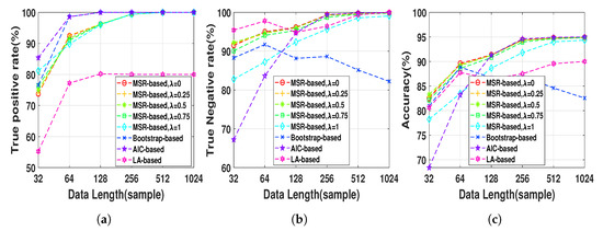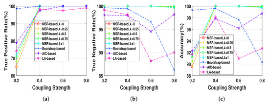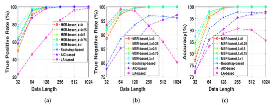 Nonlinear AR data series were first generated for 100 realizations at different lengths, , in order to evaluate the effect of data length on the performance of the NUE algorithms using AR data. We set the parameter since in this simulation there is no IC effect. Figure 6 shows TPRs, TNRs and accuracies of the NUE algorithms for the AR model as a function of data lengths. As Figure 6a illustrates, the LA-based NUE algorithm has significantly lower TPR compared to that of the other algorithms. It is also noteworthy that the TNR of the bootstrap-based algorithm tends to decrease as the data length increases. The MSR-based algorithm, for all except , presents higher accuracy than that of the bootstrap-based and LA-based algorithms at all data lengths and higher accuracy than that of the AIC-based algorithms at data length smaller than 128.