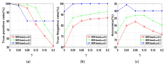 (a) true positive rates, (b) true negative rates and (c) accuracies of the MSR-based algorithm