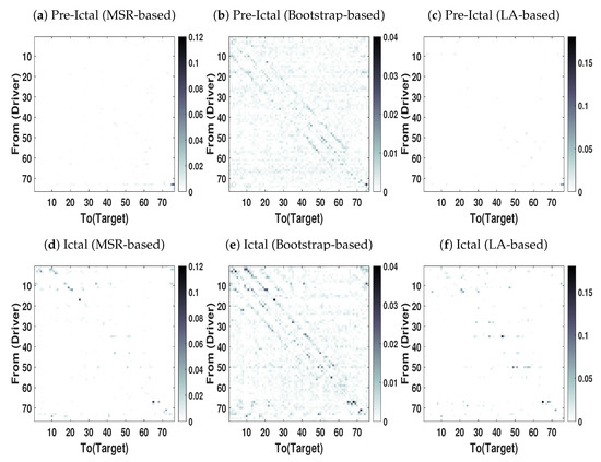 We applied our proposed in addition to bootstrap-based and LA-based NUE algorithms to estimate CTE in real high dimensional and redundant intracranial EEG data. The overall goal here is to compare advantages of our proposed NUE algorithms over the other algorithms reported in the literature. The MSR-based NUE algorithm was implemented with and . The directed dependencies matrices obtained by our proposed algorithm as well as the existing algorithms are shown in Figure 8. The directed dependencies matrices obtained by the bootstrap-based NUE algorithm (Figure 8b,e) contain many connections in both pre-ictal and ictal conditions. Specifically, the diagonal pattern observed in the matrices obtained by the bootstrap-based NUE algorithm can be due to the volume conduction and conduction effect of the grid. On the other hand, our proposed (Figure 8a,d) and LA-based NUE algorithms (Figure 8c,f) are less sensitive to the volume conduction effect in comparison to that of the bootstrap-based algorithm.