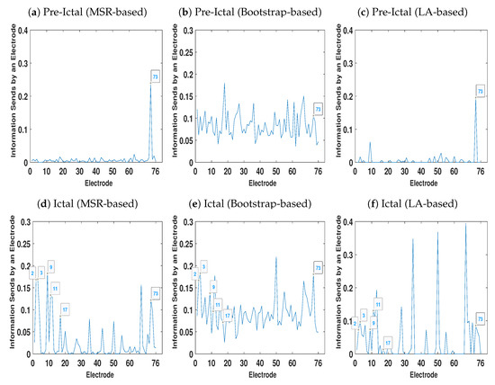 Figure 9 represents the total amount of information each electrode sends to other electrodes. As Figure 9b demonstrates, due to the volume conduction effect there are some peaks even in the pre-ictal condition. On the other hand, the amount of information each electrode sends in the pre-ictal condition obtained by the MSR-based (Figure 9a) and LA-based (Figure 9c) NUE algorithms is approximately zero except for electrode 73. This electrode can be associated with the seizure onset although it is not yet clinically observable.