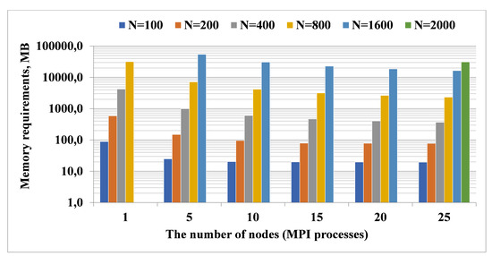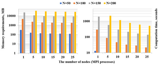 First, we consider the Data Preparation step and examine how increasing the dimension of the problem and the number of cluster nodes affect memory consumption. For the sparse model, we empirically found that it is advisable to perform 20 filtering stages when calculating the matrix R. Peak memory consumption when solving problems of size from to is shown in Figure 2. Experiments show that, when solving models of large dimension () the memory requirements per node are reduced from 54.5 GB using five nodes to 16.5 GB using 25 nodes (scaling efficiency is ). Additionally, we were able to perform calculations for , which required 31 GB of memory at each of the 25 nodes of the cluster. Computation time is significant but not critical for the Data Preparation step for the sparse problem. Nevertheless, we note that when using five cluster nodes, computation time is reduced approximately by half, compared to a single node, and then decreases slightly.