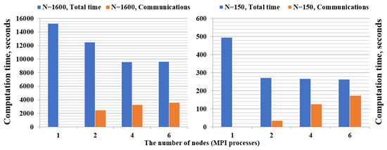 Next, we consider the ODE Integration step. In contrast to the Data Preparation step, where we concentrated on satisfying memory constraints, parallelization of this step is performed in order to reduce the computation time. Below, we show the dependence of computation time and the number of cluster nodes used for the sparse (Figure 4, left) and dense (Figure 4, right) models. First, we load previously prepared data and run the ODE Integration step for the sparse model of the size . The results show that it is enough to use only four nodes of the cluster. Further increase in the number of nodes does not reduce computation time due to MPI communications. When solving other sparse models, similar behavior is observed. Second, we load the precomputed data and run the ODE Integration step for the dense model of the size . We found that the increase in the number of cluster nodes quickly leads to an increase in the communications time, so it is enough to use two nodes to solve a dense problem of that size.