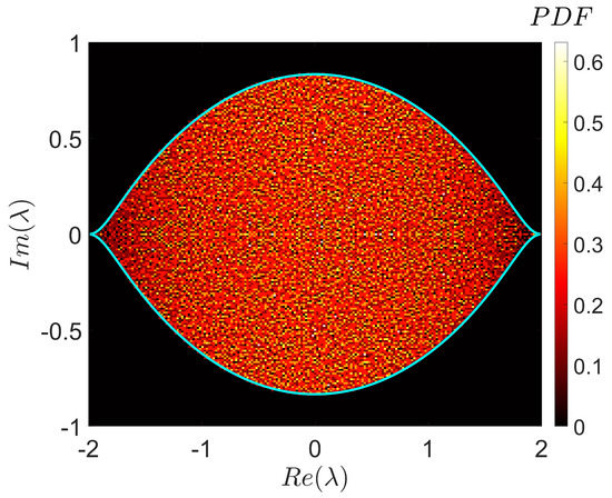 Histogram of the complex eigenvalues, , , of a single realization of a random Lindbladian (see Section 3) for . The shown area was resolved with a grid of cells; the number of eigenvalues in every cell was normalized by the cell area. Altogether, eigenvalues are presented (except ). The bright thick line corresponds to the universal spectral boundary derived analytically in [17].