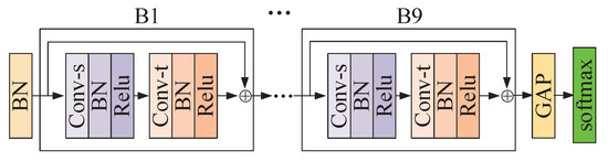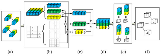 - Residual connection. The result of the matrix multiplication of the and is embedded into via a convolution, where denotes the number of output channels. If the number of input channels differs from the number of output channels, a convolution is inserted into the residual path to transform the input so that it matches the output in the channel dimension. According to Equation (4), the calculation process of VAM can be written as follows:where denotes a function of convolution. The above implementation is shown in Figure 3.