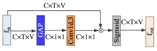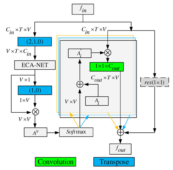- Exchange of vertex dimension and channel dimension. We interchange the vertex dimension of the input data with its channel dimension by transpose function to realize the VAM by using ECN-Net. For example, let the shape of the tensor of input feature be . Here, denotes the number of input channels and T denotes the number of frames in a video, while V denotes the total number of vertices in each frame. We transpose into to obtain a .