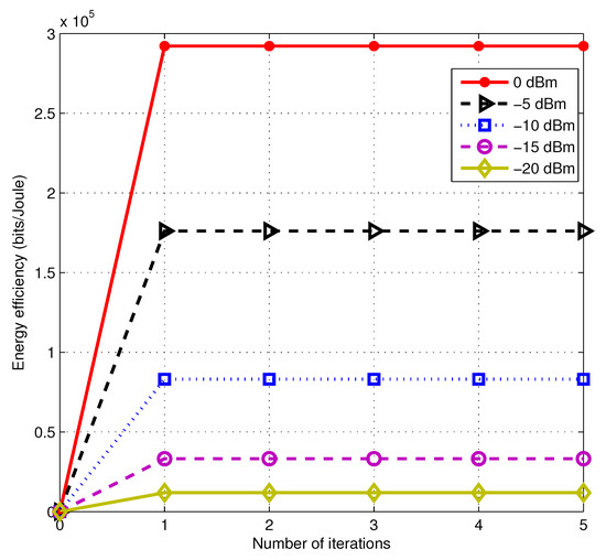 In the case of small numbers of antennas, the deterministic equivalent expression and are approximately equal [45,46]. Besides, with respect to , is still observed to be concave from (33). Thus, each subproblem in (32) does not change the convexity and still guarantees the convergence. Finally, we obtain our algorithm by two-level iteration. The optimal power allocation is obtained by the inner iteration and assigned to the outer iteration. Then, the initial power allocation of the inner layer is updated after the outer iteration. The proposed energy efficiency optimization algorithm of massive MIMO secure multicast transmission is described in detail in Algorithm 1.
